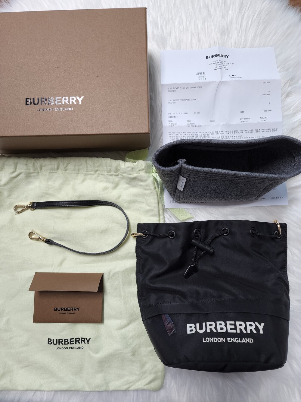 - 구성품 : 본품 ☑, 더스트 ☑, 박스 ☑ 별도 버버리 매장구매 스트랩(5만원), 이너백 ☑ 인보이스 ☑, 쇼핑백 및 기타 종이 구성품 ☑